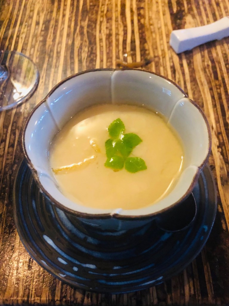 The second dish was a warm Egg Custard prepared with delicata squash and mitsuba (see photo below). Perhaps there was dashi in it, as well, as there was a slight umami flavour. To me it tasted like a next-level miso soup. I enjoyed it quite a bit.