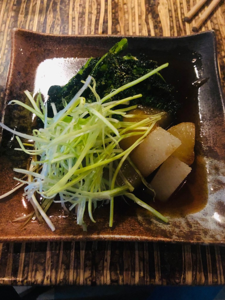 The fifth dish was probably the most interesting dish of the evening. It was a small bowl of Braised Daikon Teriyaki with Kale buds, and what appeared to be lemon grass (photo below). My partner’s came with sirloin instead of daikon.