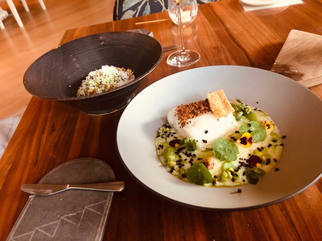 The Halibut was served with fava beans, peas, truffles, and leeks.