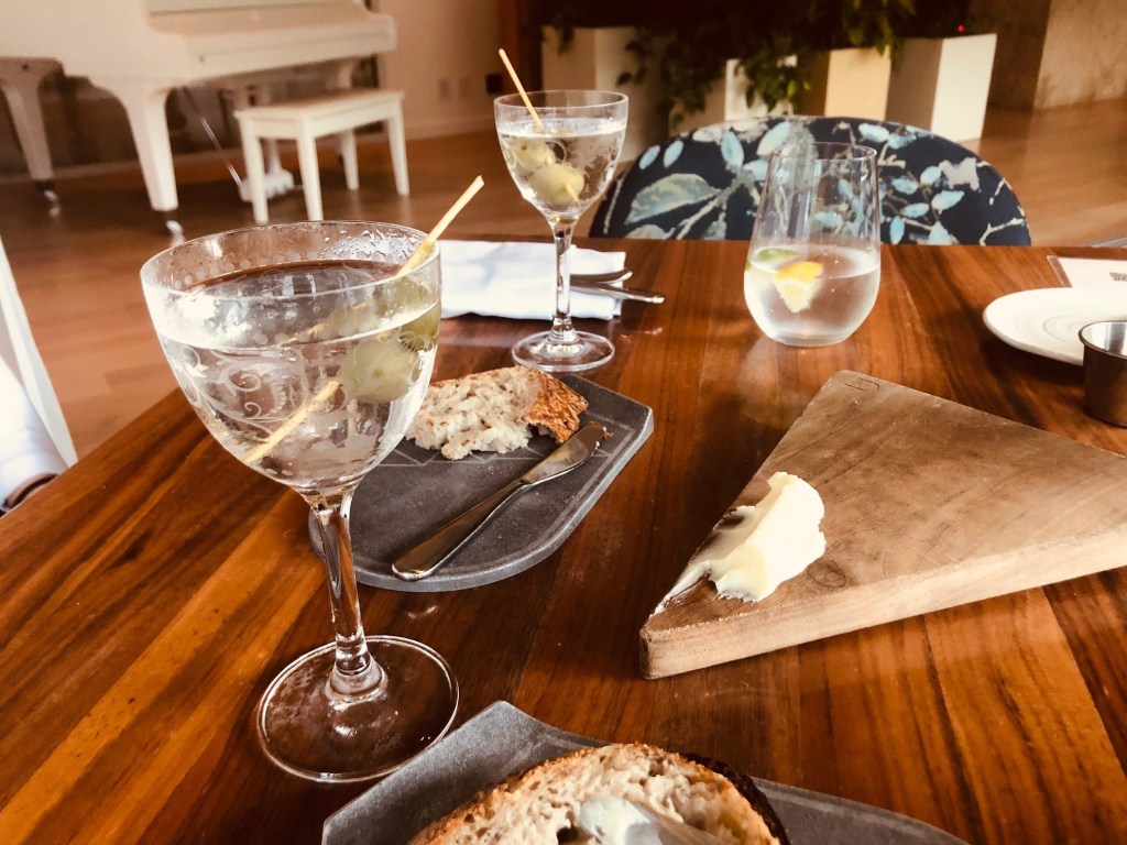 The menu included many fancy looking cocktails, fine wines, and other libations – but we wanted to keep it simple to get started – a Hendricks gin martini for me, and a Grey Goose vodka martini for the lady; both with four olives.