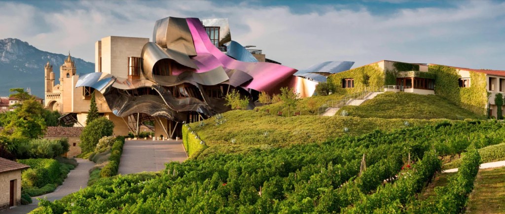 I was stricken, driving north up to Bilbao and seeing the rolling architecture of the Frank Gehry-designed hotel for the Marques de Riscal vineyard. (see photo below)