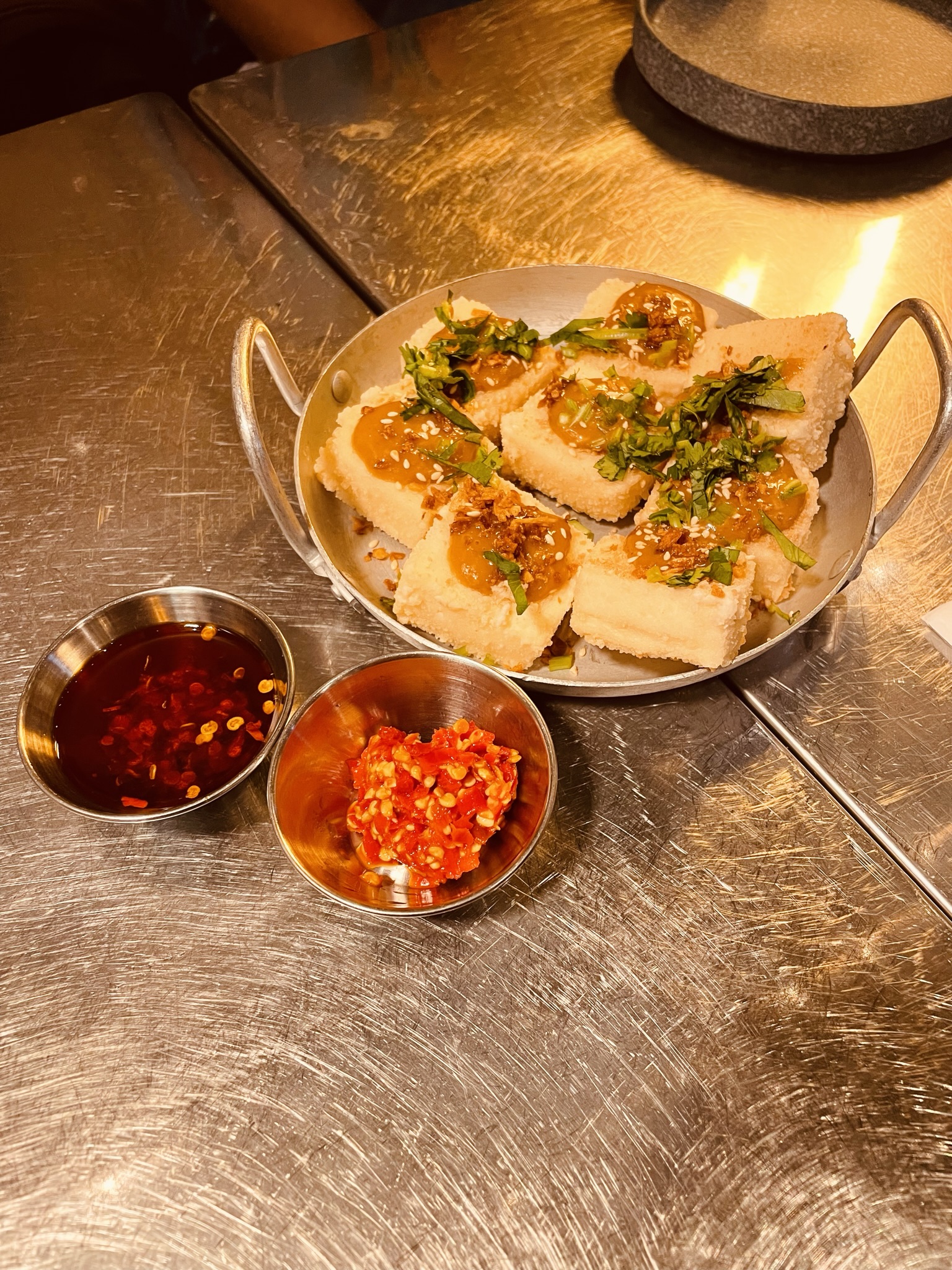The first item that arrived at the table was the Fried Tofu (photo below), which had a garlic and lemongrass glaze. When the server brought it out, she had barely placed it on the table, and was about to describe the sauce, when I asked for chilies in oil. She offered both chilies in oil and chopped up chili peppers! These guys do it right.